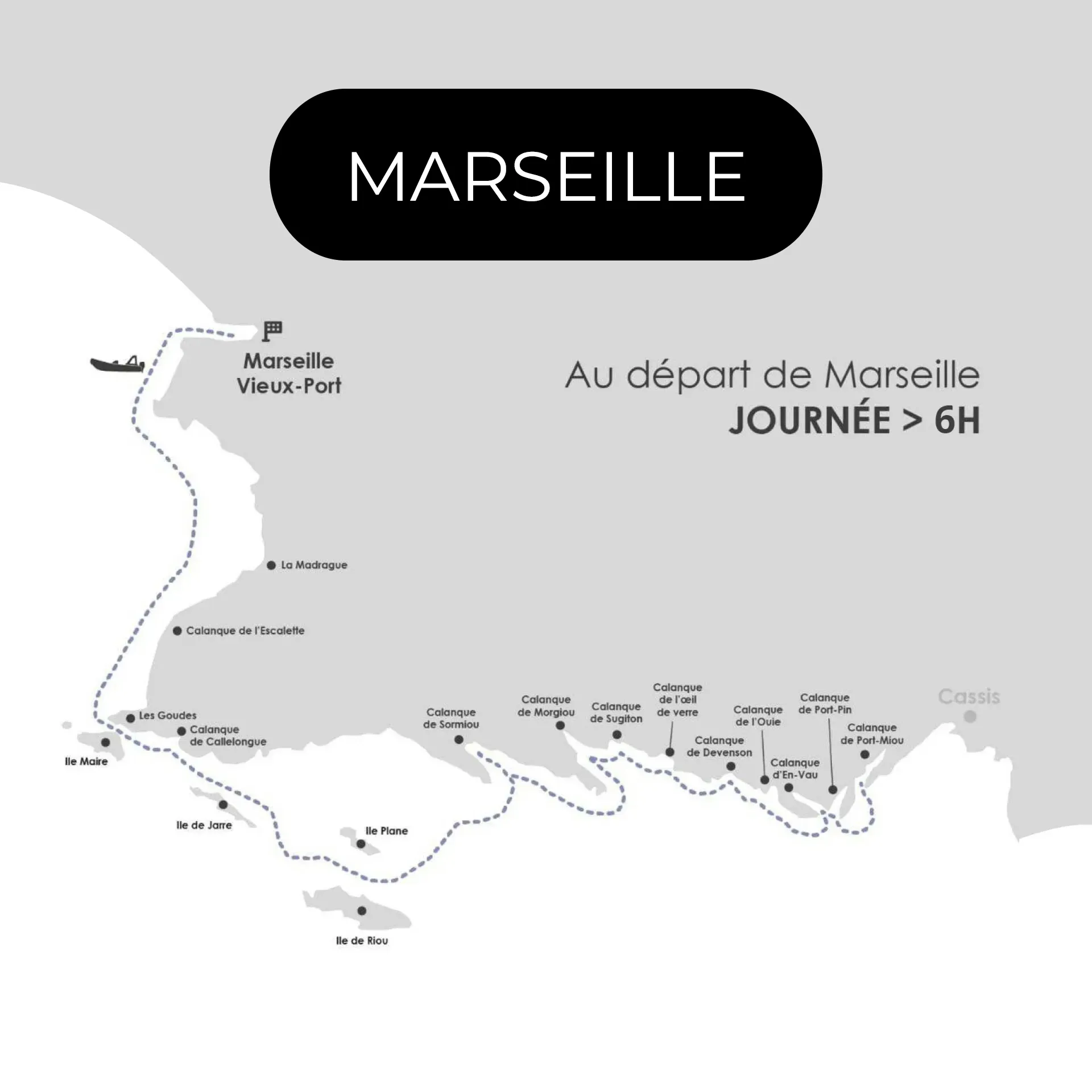 L’Eden Boat vous emmène pour une journée de détente en mer au départ de Marseille, soit 6 heures de balade ! Ce circuit n’étant pas définitif, il peut être changé en fonction de votre capitaine, de la météo du jour et à la demande du client. Votre journée commencera au Vieux-Port de Marseille, vous en sortirez en passant entre le Fort Saint-Nicolas et le Fort Saint-Jean pour débuter votre balade dans un magnifique environnement au cœur de la ville de Marseille. Vous voguerez en direction de la Pointe Rouge en longeant la Corniche et les longues plages du Prado. Vous passerez par le sublime petit port de pêcheurs de la Madrague, devant la calanque de l'Escalette pour arriver au Cap Croisette qui se situe au bout des Goudes et en face de l’Ile Maire. Le quartier Les Goudes étant connu pour son cadre spectaculaire aux portes des calanques de Marseille où il fait très bon d’apprécier un sublime coucher de soleil.  Votre capitaine vous emmènera en direction de l’Ile de Riou, en passant devant les Iles de Jarre et de la Plane (ou Calseraigne) et devant la calanque de Callelongue. L’Ile de Riou, constituant l’extrémité sud de la commune de Marseille, est très connue pour la multitude d’espèces d’animaux résidants sur l’île et pour les trésors découverts dans ses eaux. Vous vous rapprocherez finalement de la côte en passant par la calanque de Sormiou, la plus visitée des Marseillais, qui ne vous laissera pas indifférent par les paysages qu’elle propose ! Après cela, vous irez à la découverte de la calanque de Morgiou qui abrite un des villages les plus authentiques de Marseille, où les pêcheurs qui y vivent depuis des décennies se transmettent leur tradition de génération en génération. Vous continuerez votre balade en allant dans une des calanques préférées des locaux, Sugiton, connue pour son eau limpide et son plongeoir naturel ! En passant par les calanques de l'Œil-de-Verre, de Devenson et de l’Oule, vous arriverez à l’une des plus connues, celle d’En-Vau. Là-bas, le Wahou est garanti tant le paysage vous surprendra ! Vous finirez votre balade dans les calanques de Port-Pin et de Port-Miou, les deux seules calanques de votre balade ne faisant plus partie de Marseille ! Le retour se fera alors dans une nouvelle dynamique. Plus de recul, plus de vitesse pour de nouvelles sensations devant un panorama à couper le souffle ! Votre journée de découverte se terminera dans le Vieux-Port de Marseille, la tête pleines de beaux souvenirs. Pour plus de renseignement sur la balade en bateau au départ de Marseille pour la journée, contactez-nous au 04.69.00.22.83.